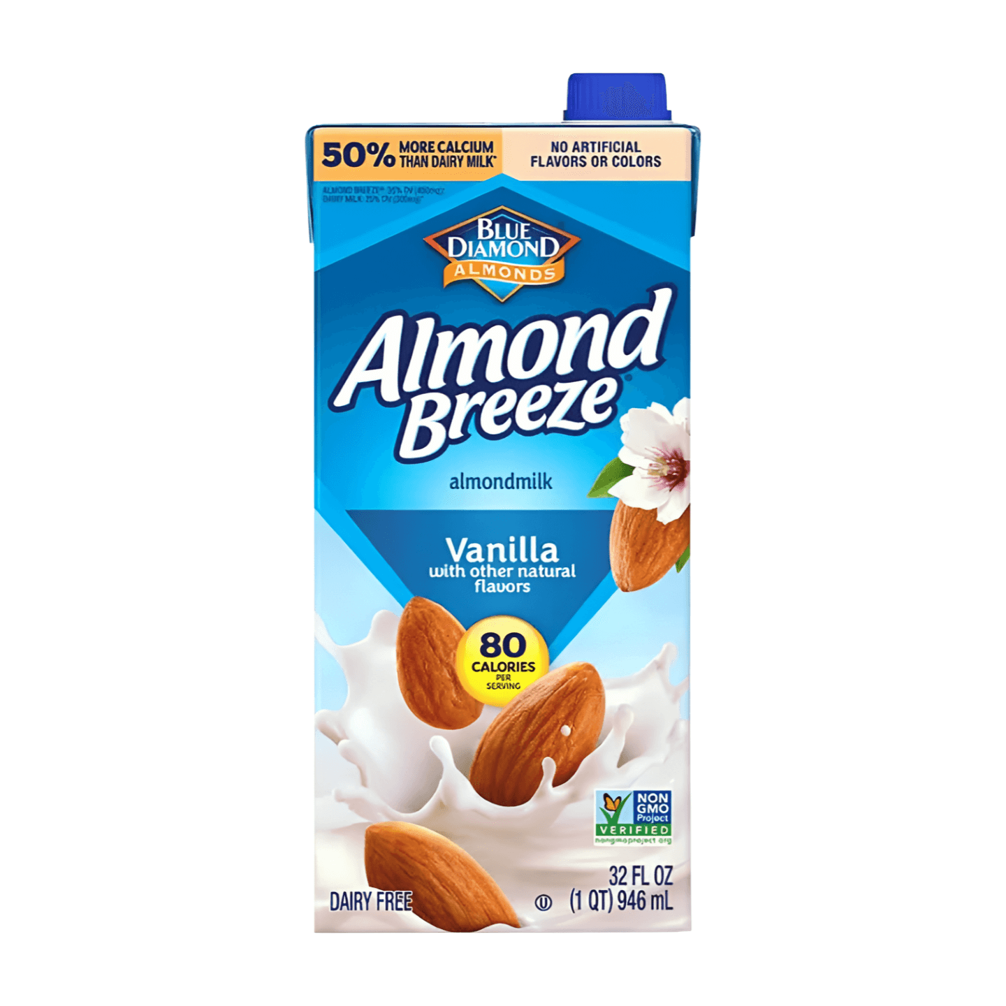 Almond Breeze Reduced Sugar Vanilla Almondmilk is a vanilla-flavored almond milk with less sugar than the original version for those who want just a hint of sweetness. Each 240-mL serving contains 60 calories, and it is gluten-free and vegan with no artificial flavors.