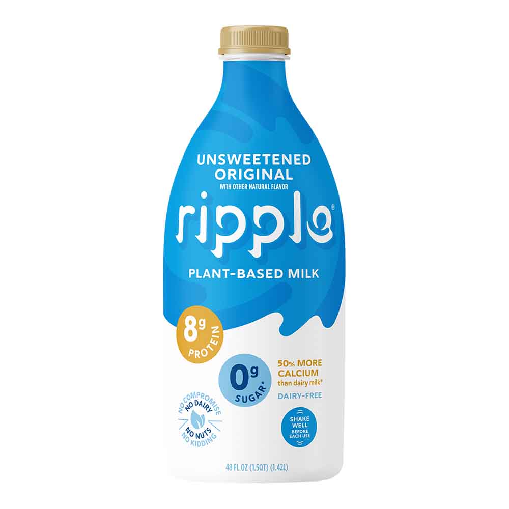 Ripple Oatmilk + Protein Plant-Based Milk is made from oat milk and pea protein and fortified with vitamins A, D, and B12 and essential minerals like iron and calcium while providing 6 grams of protein per serving. It can be used in recipes or enjoyed as a standalone drink for added protein.